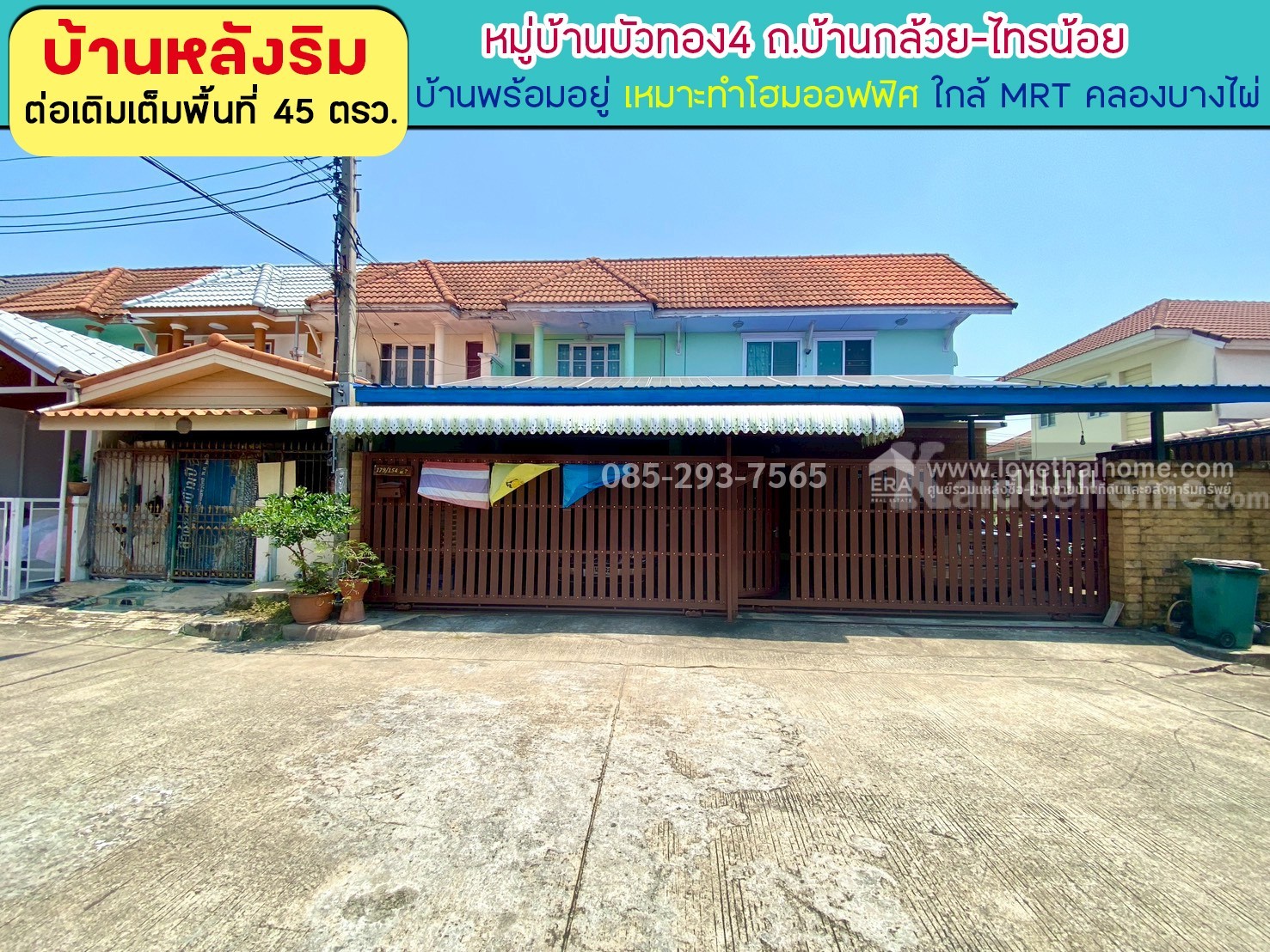 ขายทาวน์เฮ้าส์ 2 ชั้น หมู่บ้านบัวทอง4 ถนนบ้านกล้วย-ไทรน้อย พื้นที่ 45 ตารางวา หลังริม ต่อเติมเต็มพื้นที่ ขายเพียง 2.8 ล้านบาท เหมาะทำโฮมออฟฟิศ ใกล้ MRT คลองบางไผ่
