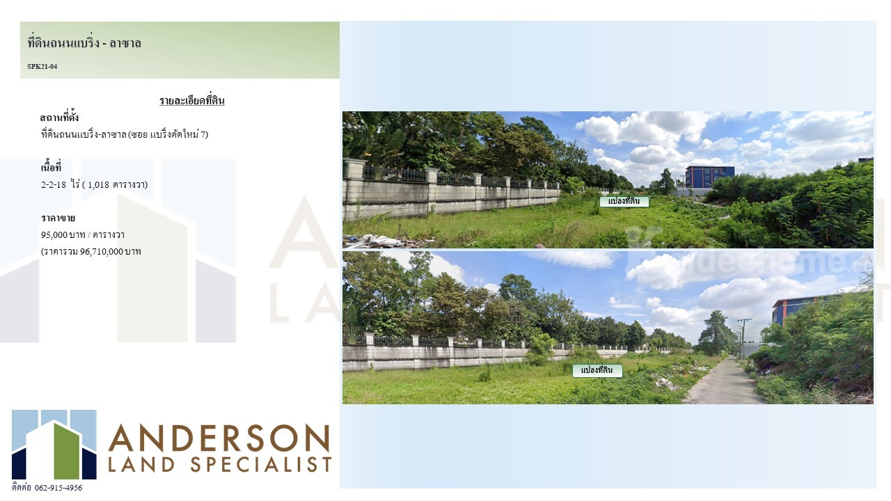 ขายที่ดิน ถนนแบริ่ง-ลาซาล (ซอย แบริ่งตัดใหม่ 7) เนื้อที่ 2-2-18ไร่ (1,018 ตารางวา)