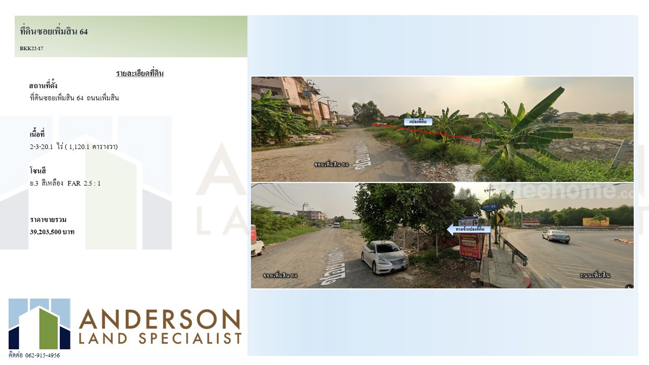 ขายที่ดิน แปลงซอยเพิ่มสิน 64 ถนนเพิ่มสิน เนื้อที่ 2-3-20.1ไร่