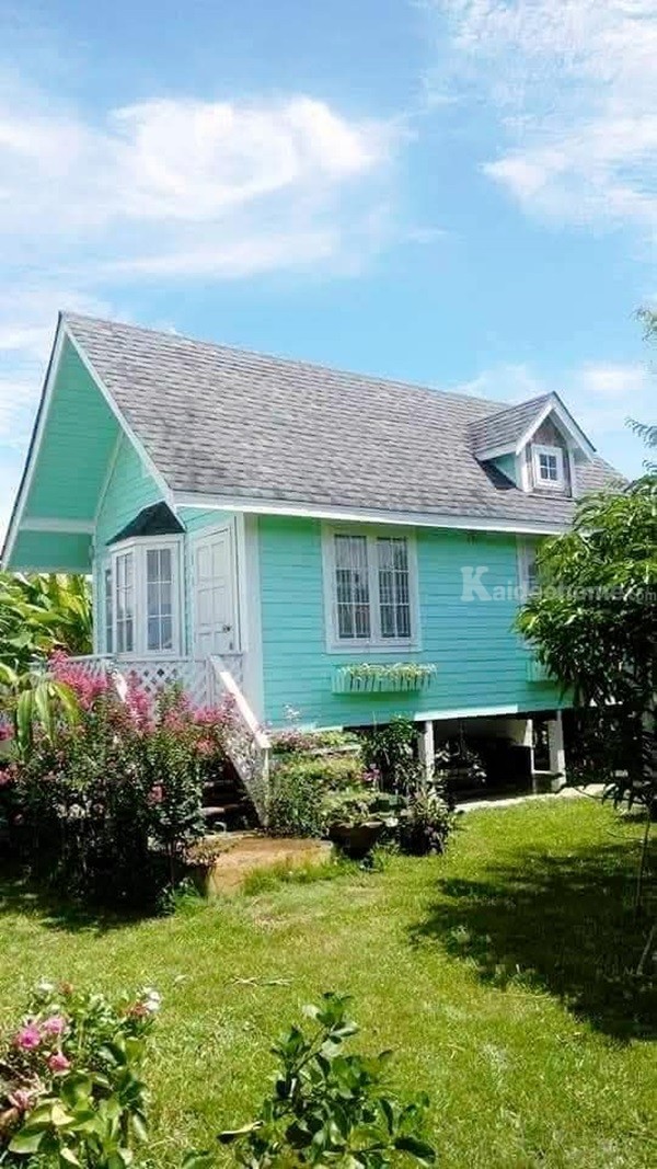 – บ้านไม้สนยกพื้นสูงพร้อมระเบียง 1 ห้องโถง 1 ห้องนอนเล็กและห้องใต้หลังคา มีบ้านเล็กสำหรับครัวแยก 1 หลังพร้อมโรงรถ