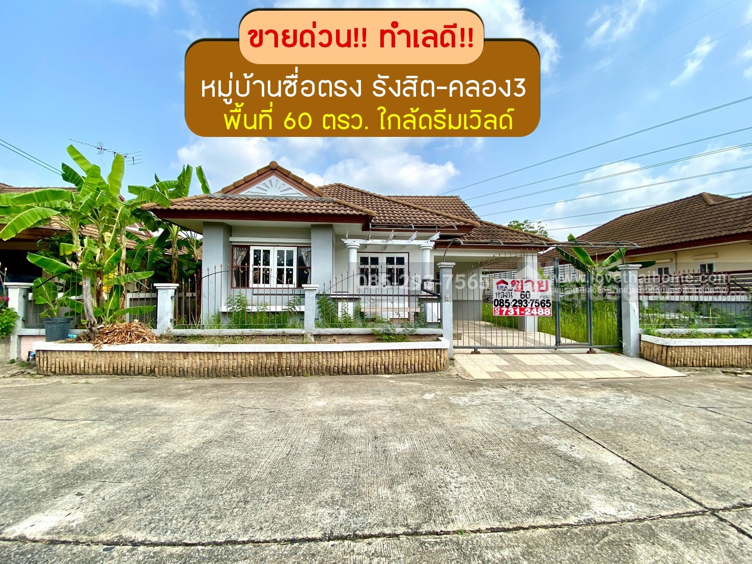 ขายบ้านเดี่ยว หมู่บ้านซื่อตรง รังสิต-คลอง3 ถนนรังสิต-นครนายก พื้นที่ 60 ตารางวา ขาย 3.3 ล้านบาท โครงการใหญ่ ใกล้สวนสนุกดรีมเวิลด์