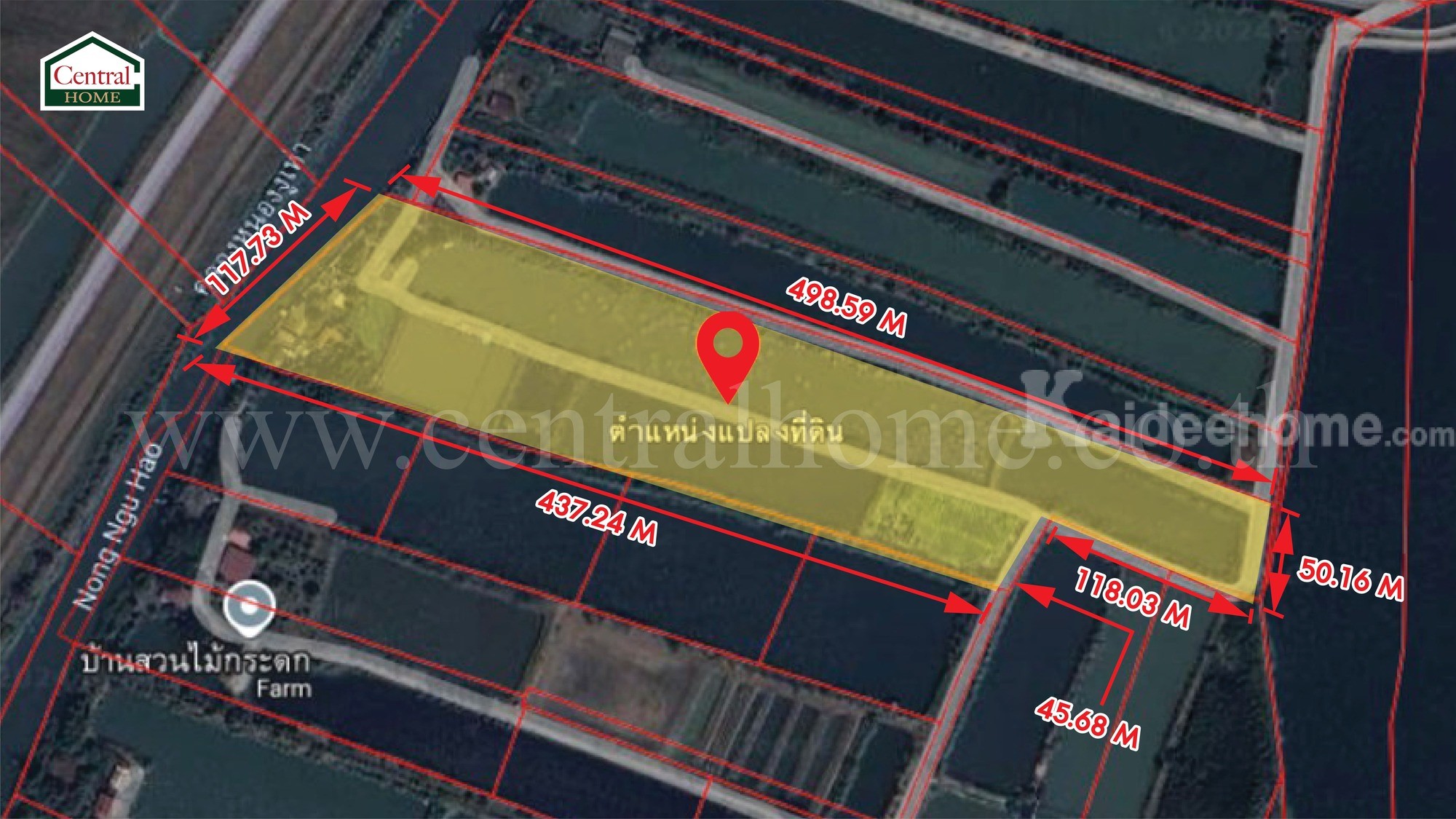 – ที่ดินรูปตัว L , หน้ากว้างฝั่งติดถนนหลวง 50 เมตร, ความลึก 500 เมตร, หน้ากว้างฝั่งสนามบินสุวรรณภูมิ 117 เมตร, ความลึก 438 เมตร