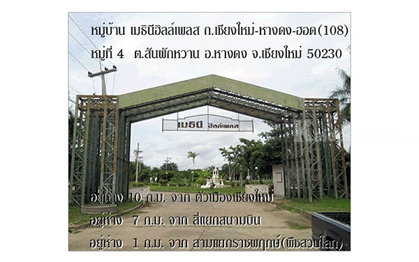 ที่ดิน หมู่บ้านเมธินีฮิลล์เพลส อยู่ ถ.เชียงใหม่-หางดง(108) หลักก.ม.10 เข้าซอย 500 เมตร ต.สันผักหวาน อ.หางดง เชียงใหม่