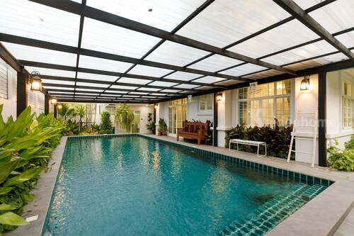 //สระว่ายน้ำระบบเกลือ ขนาด 4*10 ม. พร้อมมุงหลังคาใส ป้องกันฝุ่น และใบไม้