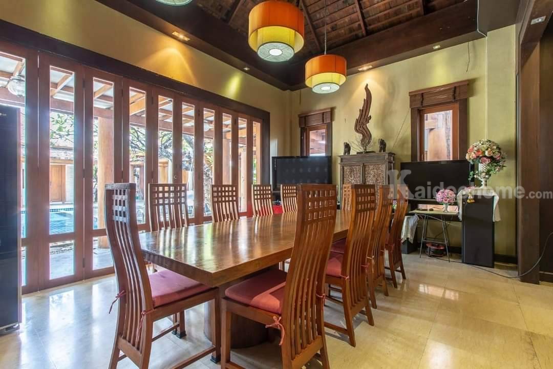 -ห้องรับประทานอาหาร: โต๊ะทานข้าวไม้สักหนา 3-4 นิ้ว เพดานสูง พื้นที่กว้าง