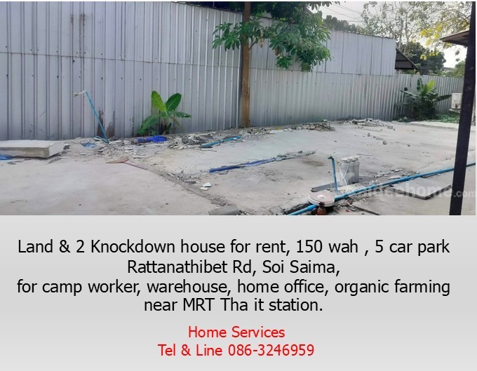 Land & Knockdown House for rent, 150 wah , Rattanathibet Road, Soi Saima, for home office, warehouse, camp worker, organic farming near MRT Tha it station.