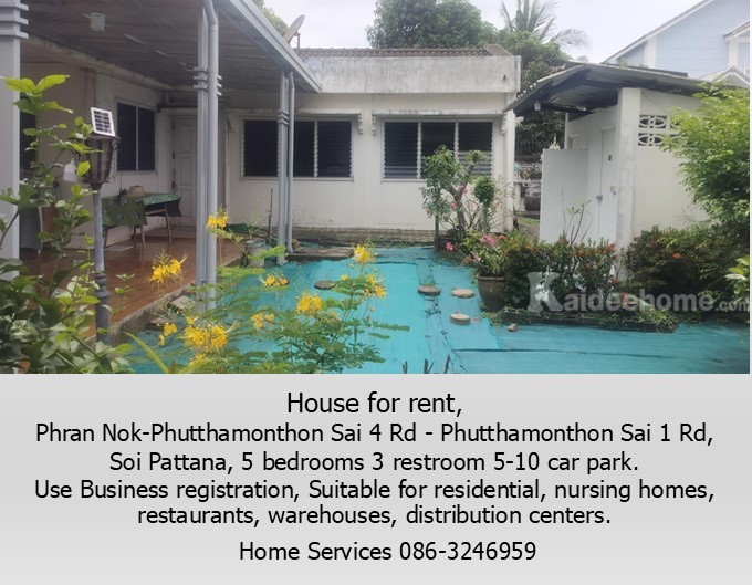 House for rent, Soi Pattana, Phran Nok-Phutthamonthon Sai 4 Rd – Phutthamonthon Sai 1 Rd, 5 br 3 rr 5-10 car park. Use Business registration, Suitable for residential, nursing homes, restaurants, warehouses, distribution centers.