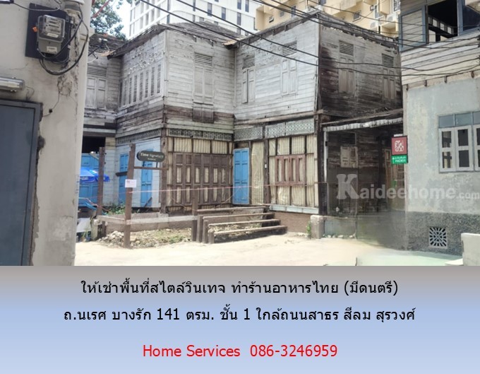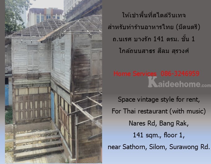 ให้เช่าพื้นที่สไตล์วินเทจ สำหรับทำร้านอาหารไทย (มีดนตรี) ถ.นเรศ บางรัก 141 ตรม. ชั้น 1 ใกล้ถนนสาธร สีลม สุรวงศ์