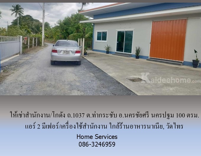 Office/warehouse for rent, 1037 rd, Thakrachub Subdistrict, Nakhon Chai Sri District, Nakhon Pathom 100sqm., 2 air, furnished/office equipment, near Nania Restaurant and Wat Sai.