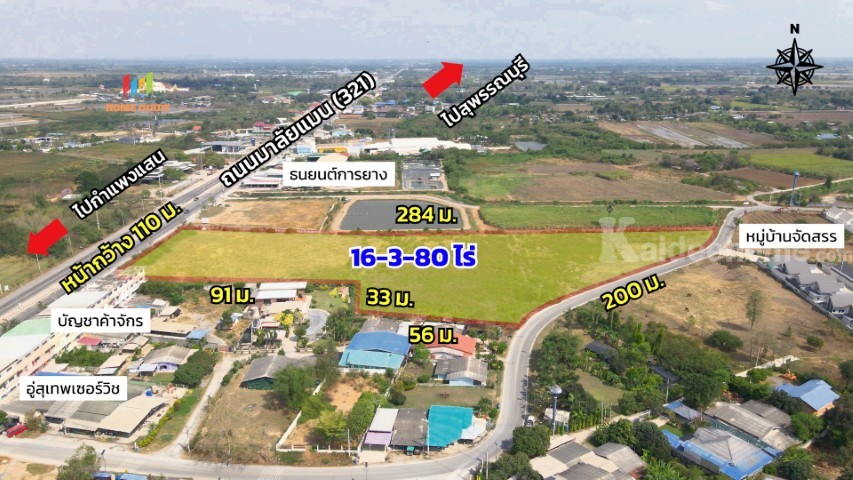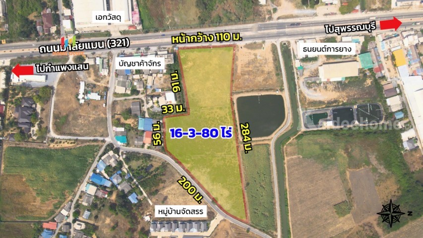 ที่ดินติดถนนใหญ่ 4 เลน ทางหลวง 321 มาลัยแมน เส้นเชื่อมต่อนครปฐม-สุพรรณบุรี ต.สระสี่มุม อ.กำแพงแสน จ.นครปฐม เนื้อที่ 16 ไร่ 3 งาน 80 ตารางวา หน้ากว้าง 110 เมตร ลึก 284 เมตร ด้านหลังชนถนนลาดยางกว้าง 6 เมตร ห่างจากมหาวิทยาลัยเกษตรกำแพงแสนเพียง 6 กิโลเมตร อยู่เยื้องร้านเอกวัสดุ ใกล้โรงเรียนหนอกพงนก วัดหนอกพงนก อบต.สระพัฒนา และโรงเรียนการบิน เหมาะทำกิจการร้านค้า โกดัง โรงงานขนาดเล็ก หรือปั้มน้ำมัน